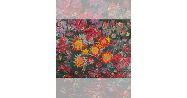 Abstract digital painting featuring a dense constellation of vibrant star-burst shapes. The background is filled with layered red, purple, and teal floral-like explosions, while the center highlights bright yellow, orange, and turquoise spiked sunbursts. The composition blends sharp geometric edges with painterly textures, creating an energetic, chaotic, and luminous visual field. Artwork created by Serj Éty’n