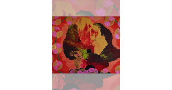 the crouwn on Serenidad Abstract painting dominated by a large, crown-like organic form in deep red, gold, black, and green, centered on a textured warm coral background. Surrounding the central shape are stylized floral elements with pink and gold petals connected by green stems. The composition evokes a regal, radiant presence with layered colors and flowing textures. Created by Serj Éty’n.